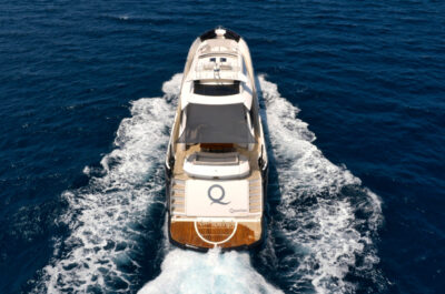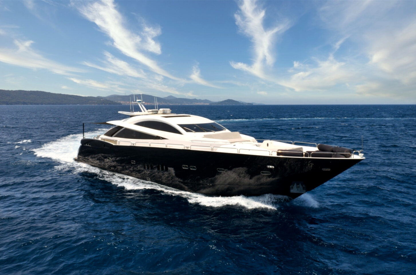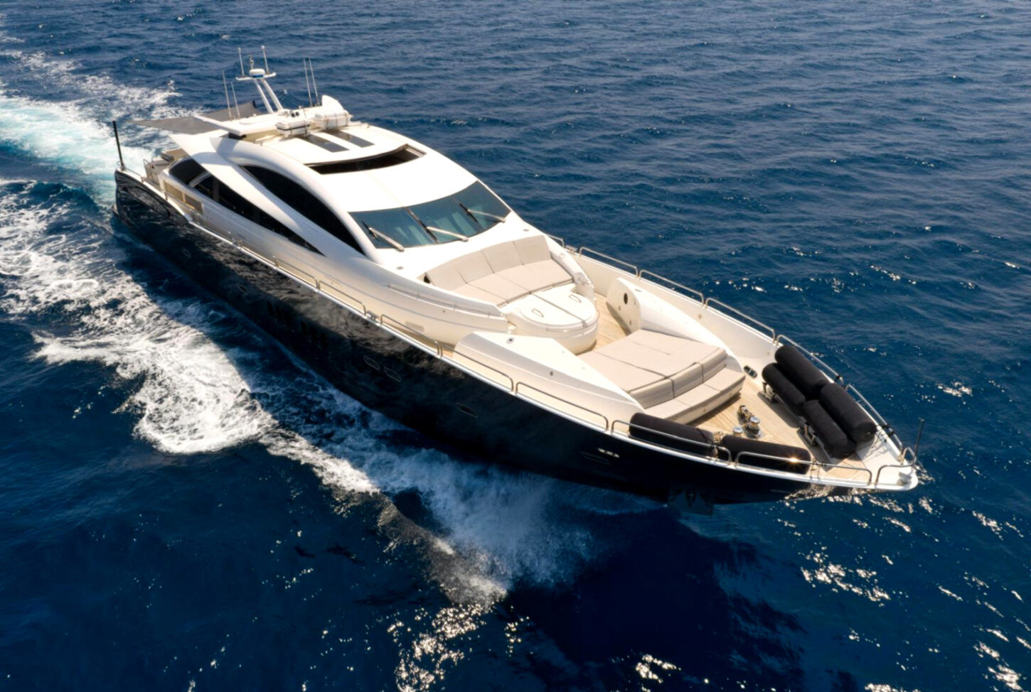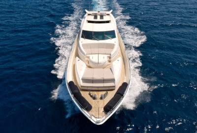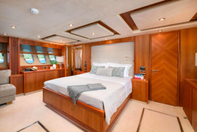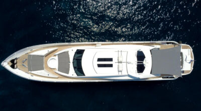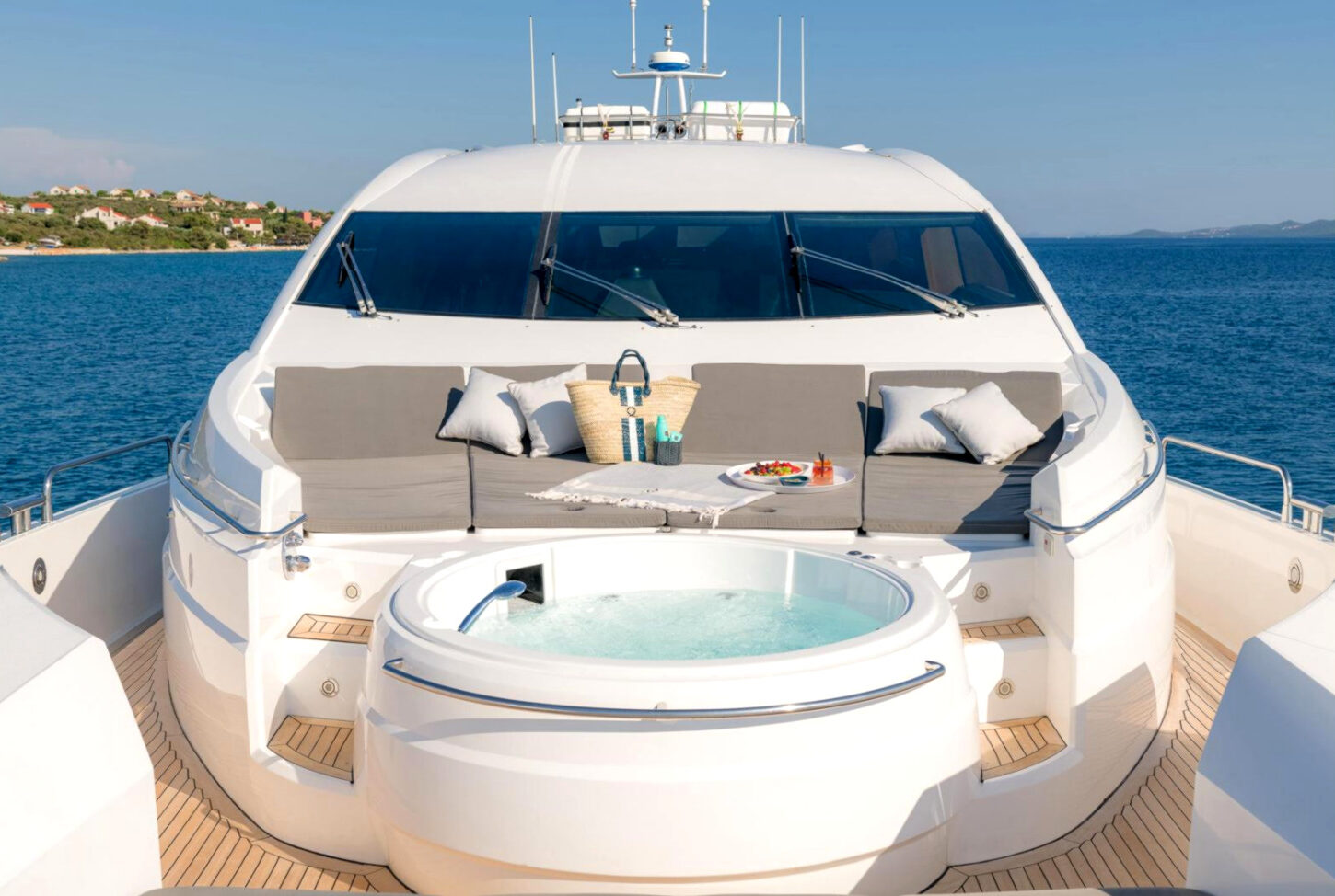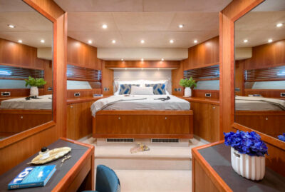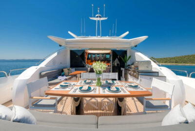 - Nadstandardní výbava: vířivka, venkovní bar, prostorný flybridge a moderní AV systémy